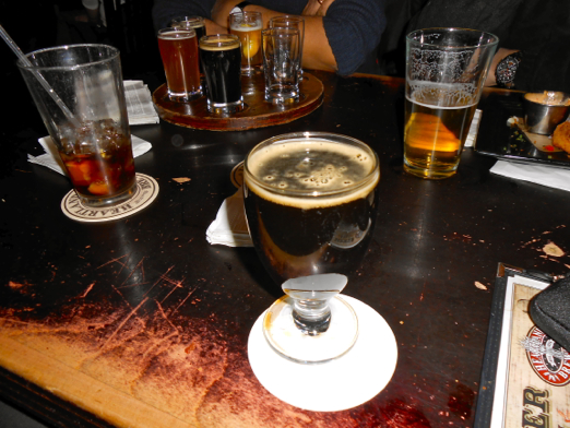 My next quaff was an Imperial Oatmeal Stout, a right whopping strong beer (9.5%) served in a girly-glass. By comparison, their Farmer John's Oatmeal Stout is a mere 6.0% ABV. Yes, the Imperial was great, but yes, it's a little too strong on the alcohol.