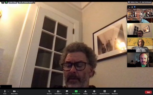 David and Kevin soon joined us and despite the mediated experience of a Zoom session, it felt a little like DNO's of old. David was working on a chocolate bacon-infused bourbon Old Fashioned. Kevin was enjoying a can of Bronx Brewing Streetwise Imperial IPA. For grains, in addition to malted barley, there are red wheat and oat flakes as adjuncts. The "festival of hops" come from all over and include Caliente, Calypso, Cascade, Centennial, Comet, NZ Dr. Rudi, Exp 04190, Exp 07270, El Dorado, and Idaho 7. It's another extremely heavy beer: 9.5% ABV.